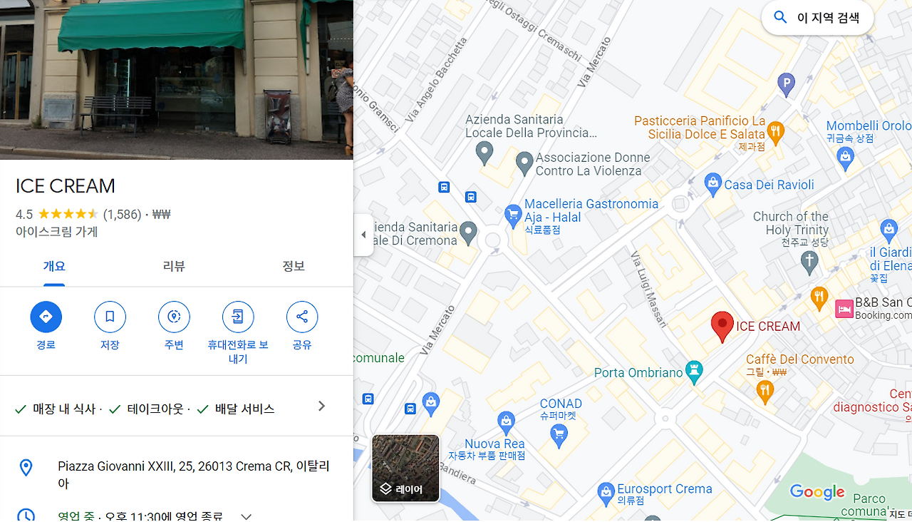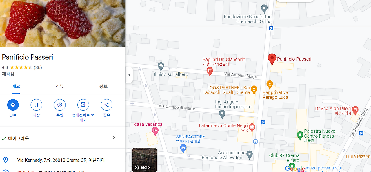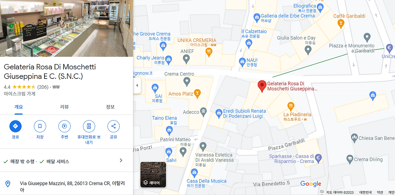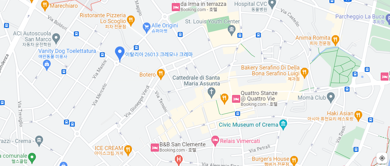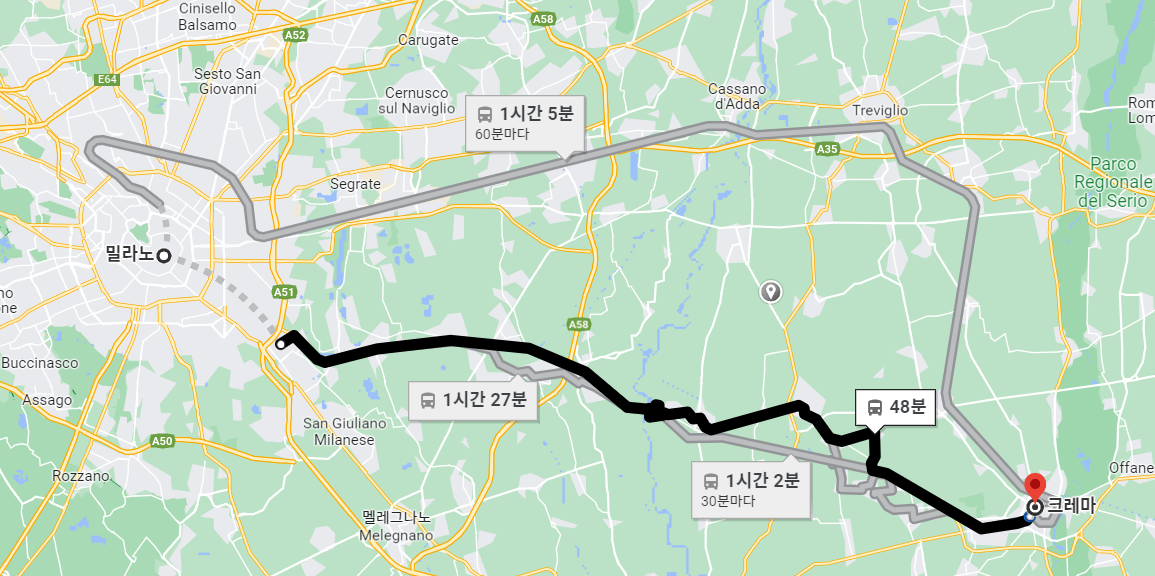 구글지도로 검색했을 때 가는 방법은 크게 서너가지로 나오는데, 소요시간이 1시간 정도로 비슷하다. 아니, 이 정도 거리면 서울 끝에서 끝으로 이동하는 정도가 아닌가? 밀라노에서 크레마가 이렇게나 가까웠다니. 물론! 기차나 버스로 1시간이라는 점~