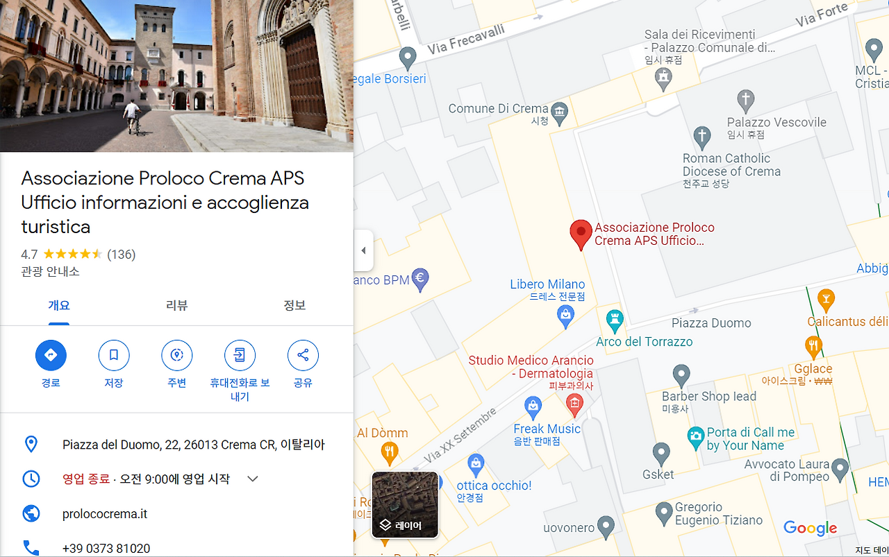 제일 먼저 "크레마 인포 관광센터"를 반드시 찾아야 지도를 구할 수 있는 것 같아요.