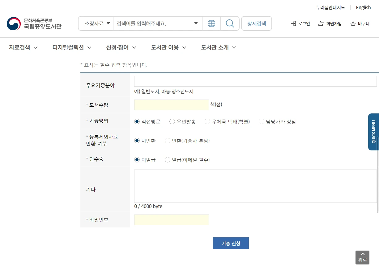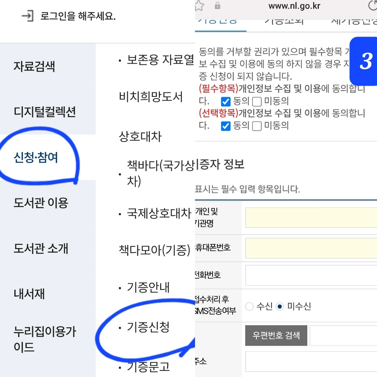 우선 컴퓨터로 신청했다. 국립중앙도서관 사이트에 들어가 로그인을 위한 회원가입을 하고 상단에 '신청, 참여'를 누르니 '책다모아(기증)'란 글이 보였다. 책을 기증할 때는 5년 안에 출판된 깨끗한 책이어야 한다는 기본사항을 읽고 접수사항들을 적었다. 기증방법으로 4가지가 있었다.