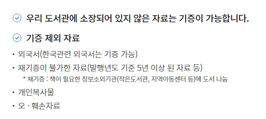 3. 기증할 수 있는 책은 깨끗한 책으로 발행 연도 5년 안이어야 한다.