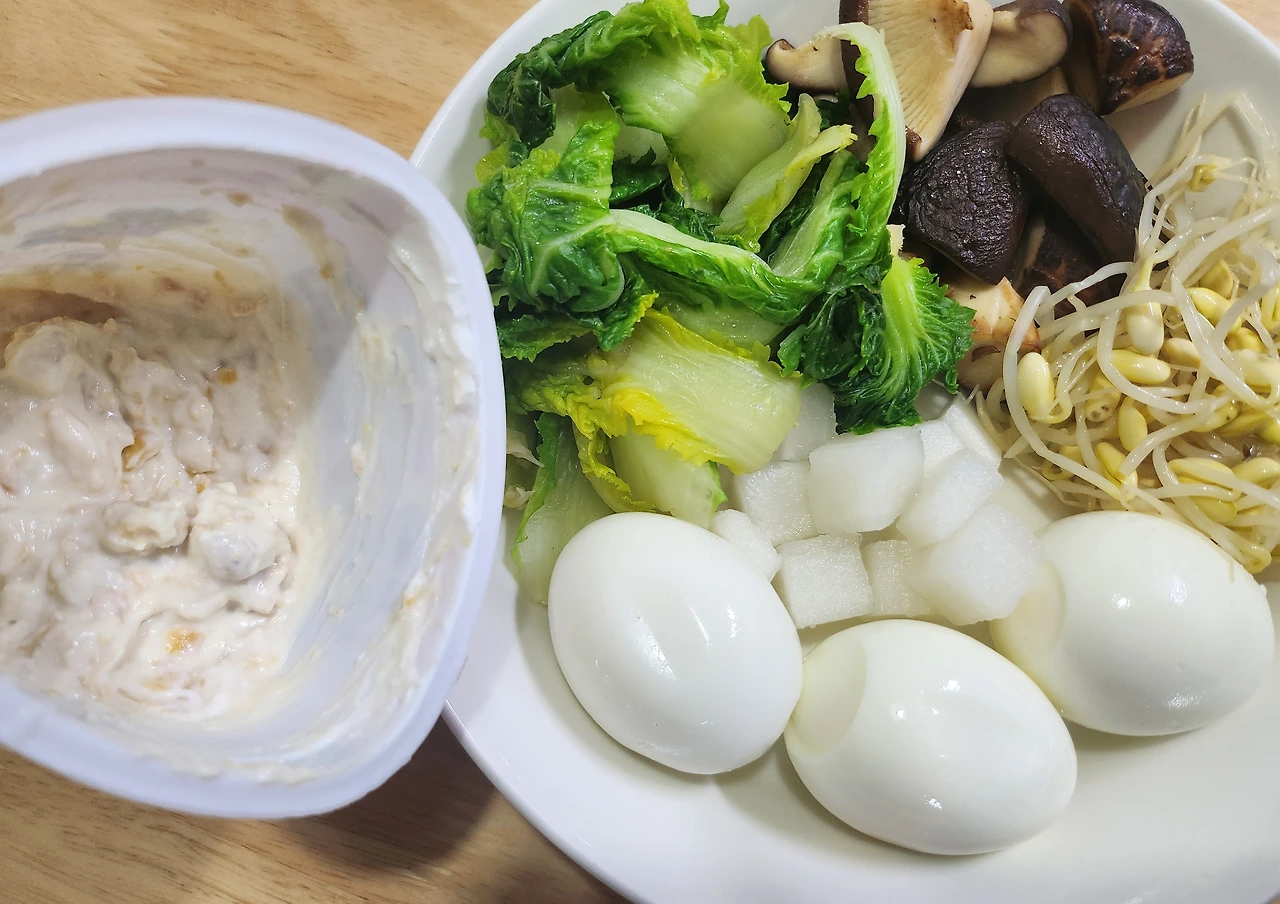 - 저녁 : 야채찜 + 으깬 병아리콩 + 그릭요구르트 200g + 쌈무 + 삶은 콩나물 + 삶은 계란 3알