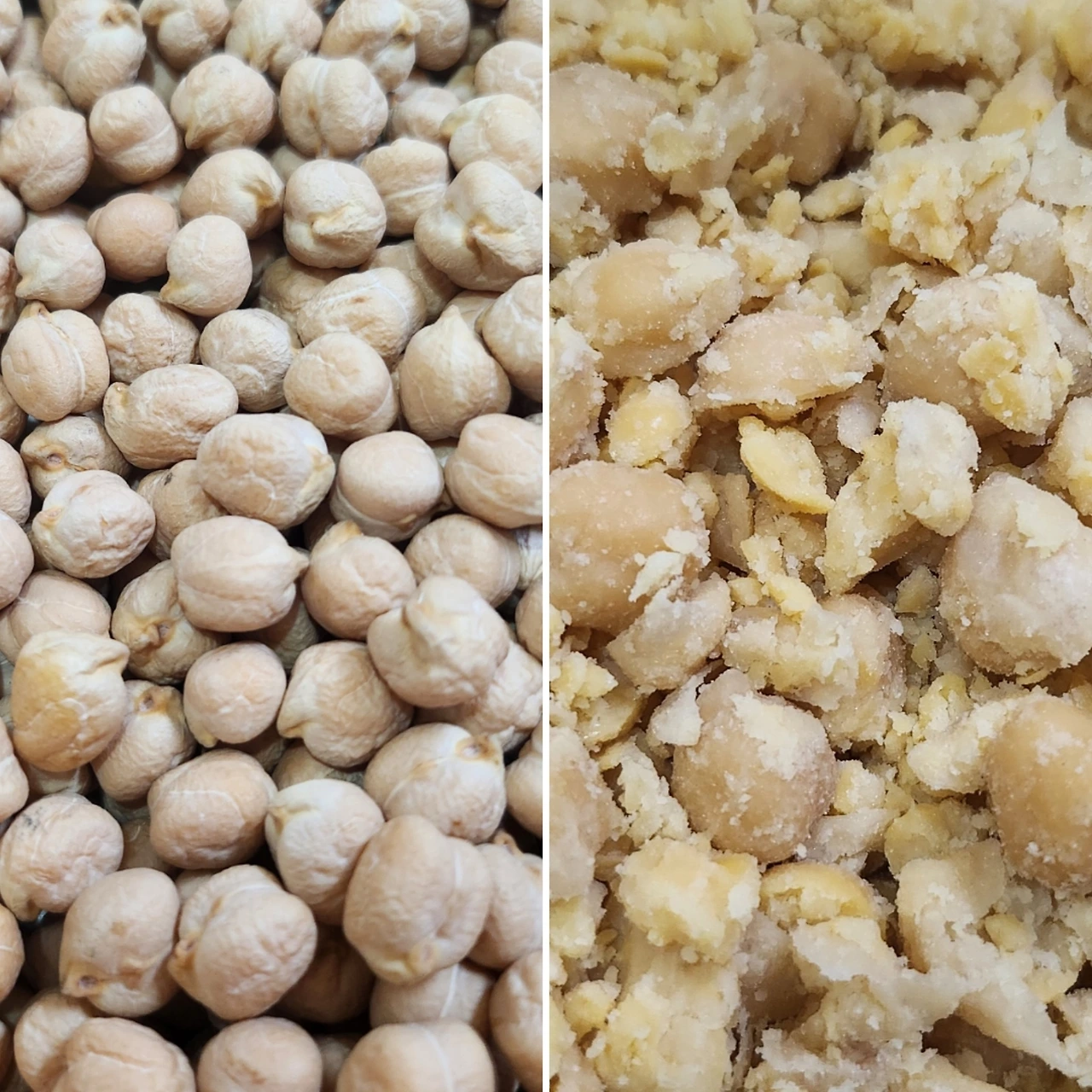 병아리콩을 불리고 삶아서 으깬 상태(오른쪽)
