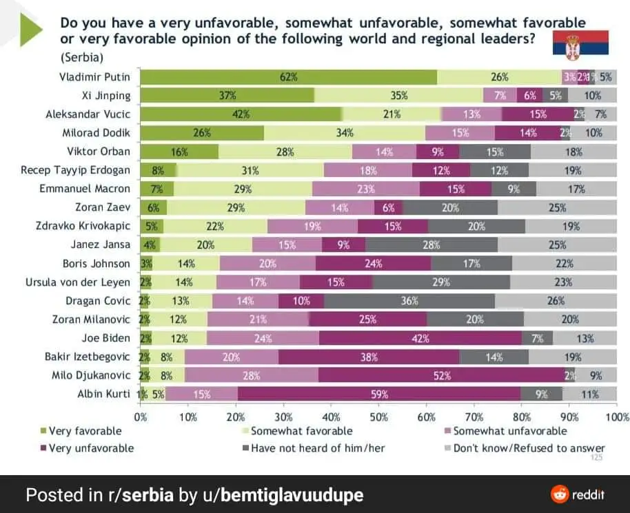 덕분에 세르비아인들은 전쟁 끝난지 한참 지났음에도 여전히 나토를 증오한다. 어느 여론조사에서 세르비아인이 가장 좋아하는 정치인으로 뽑힌 건 62%를 얻은 푸틴이었으며 이는 자국 현직 대통령 알렉산다르 부치치보다도 높은 순위다. 그 외 상위권에 등재된 정치인으로는 중국의 시진핑, 헝가리의 빅토르 오르반 등 반서방 대표 정치인들이 다수였다. 반면 가장 혐오하는 정치인은 당연하게도 코소보, 보스니아, 크로아티아의 정치가들이지만 비 발칸 국가 정치인 중 조 바이든이 유일하게 혐오 정치인 TOP 4에 들었는데 이는 미국이 한 때 서로 인종청소를 벌였던 옛 유고 연방 구성국들 만큼이나 싫다는 걸 방증한다.
