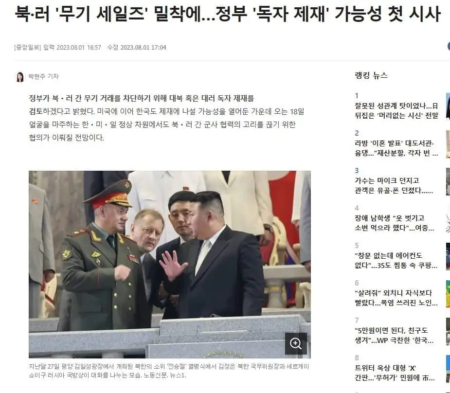 러시아 국방장관 쇼이구가 북한을 방문해 김정은을 만나 군사협력을 약속한 거, 이건 미친 짓이다. 한국 정부가 우크라이나와 공조를 강화하고 자빠진 것과 별개로 러시아 입장에서도 이래봐야 좋을 건 없다. 일단 군사협력을 둘째 치더라도 쇼이구가 북한을 방문한 것도 그냥 방문한 것도 아니고 조국해방전쟁 승전 기념식에 러시아 정부를 대표하여 참석한 것이다. 미국 대통령이 야스쿠니 신사나요시다 쇼인이 세운 학교인 쇼카손주쿠에서 지나사변(중일전쟁) 일본군 희생자 추모식 또는 한일합방 기념식에 참석한다는 것과 다를 바 없는 짓을 한 셈.