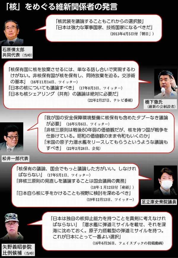 유신회의 안보 공약은 어쩌면 자민당 이상인 측면이 있다. 단순히 주변국에 적대적이냐 마냐를 떠나 기시다 총리가 하기 전부터 방위비 GDP 대비 2%로의 증액이나 적극적 방위 능력 구축은 보수 본류 성향인 기시다 후미오보다도 안보는 훨씬 오른쪽에 있다고 보여진다. 심지어 자민당보다도 더욱 크게 나가는 부분은 핵공유를 발언한다는 것이다. 여기서 핵 공유란 미국이 동맹국에 핵무기를 배치하고 공동으로 관리하는 방식인데 한국에서도 홍준표 등 일부 정치인들이 주장하여 논란이 된 적이 있었다.