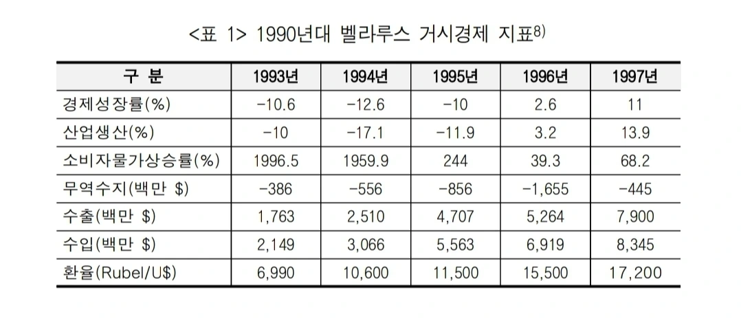 벨라루스는 그렇다면 어떨까? 그들은 소련이 무너지자 타격을 직격으로 맞으며 1990년대 동안 독자적인 경제개혁을 하지 못했다. 오히려 옐친의 경제개혁의 안좋은 여파만 더 받았었고. 1993년까지 벨라루스는 가격 자유화를 제외한 제대로 된 시장경제 개혁조치를 하지 못했으며 1994년에야 국영기업 사유화가 시행될 정도였다. 그리하여 1994년 동안 벨라루스는 농업생산량 -36%, 수송 및 통신 -3%, 건설업 -12%를 기록했으며 1992~1994년 동안 인플레이션은 약 25%를 보였다. 특히 인플레이션의 경우 에너지 가격 상승과 국채 발행으로 발생한 적자 보전 등이 원인이었으며 통화가치가 무력화되자 자연스레 실물자산에 대한 투기가 극심해졌다.