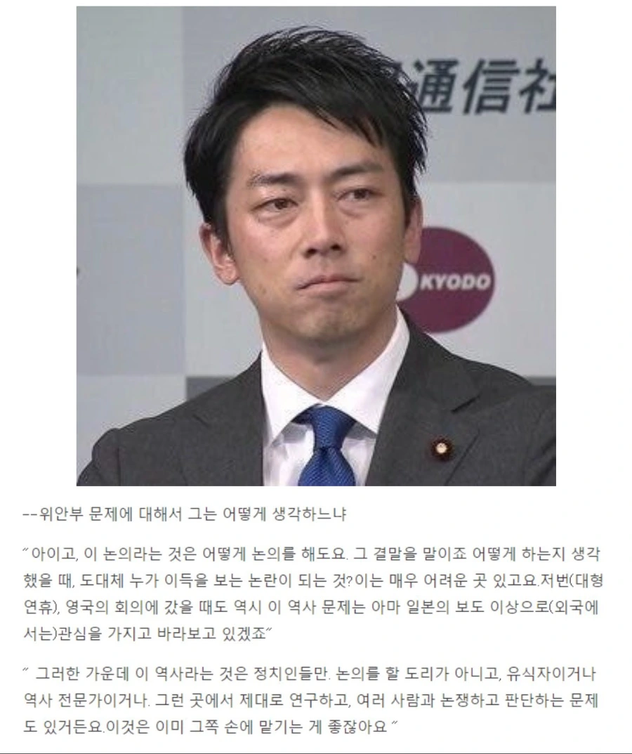 그리고 "日 차기 총리? 내가 만난 고이즈미 2세"라는 2018년 4월 6일자 주간조선의 기사에서 나온 바에 따르면 마이클 그린이 추구하는 ‘한·미·일 3각 군사동맹’을 넘어선 시각을 제시할 아젠다가 있었다고 하며 일본인은 영어를 못한다는 편견을 깰 정도의 미국 정책통들과 1 대 1 영어 대화가 가능한 수준으로 언어 실력도 확실했다고 한다. 실제로 그가 한번 제대로 정치력을 보여준 적이 있었던 모리토모 비리 사건 정국에서는 아베를 강하게 비판하며 물론 어디까지나 여론조사상이었긴 하지만 아베의 지지율을 뛰어넘는 지지를 받았던 적도 잠깐 있긴 했을 정도였다.