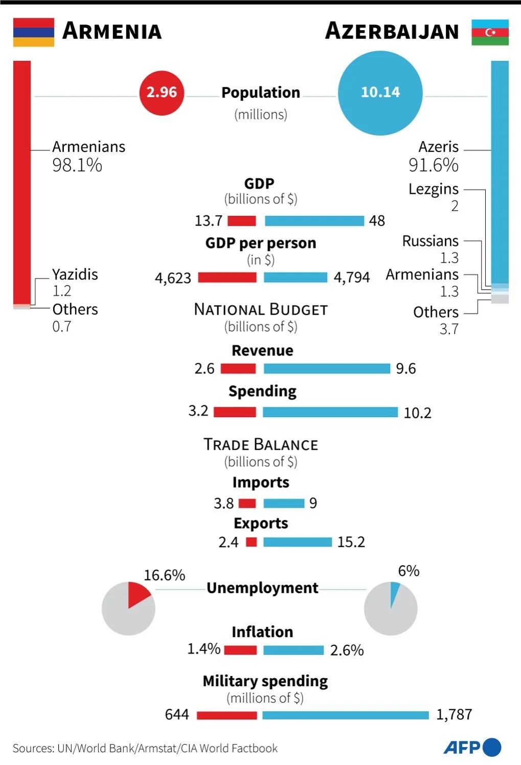 경제력, 국방비 지출 만큼이나 중요하지만, 놓치기 쉬운 아르메니아가 결코 아제르바이잔을 이길 수 없던 요인은 바로 아제르바이잔의 영악한 외교술에 있다. 일각에서는 아르메니아vs아제르바이잔 구도를 단순히 러시아와 튀르키예의 대리전 수준의 단면적인 것으로만 이해하는 경우도 있는데 그리 간단한 문제가 아니다. 물론 아르메니아에게 있어서 러시아는 에너지 자원의 75%나 의존하는 대상인 나라이고 수출입의 20~30%대 사이의 규모를 대(對) 러시아 무역이 차지하고 있는 실정이다. 러시아 입장에서도 그루지야 장미 혁명을 시작으로 반러 벨트가 형성되어 만약 이들이 나토에 가입한다면 지정학적 고립을 불러올 수 있다는 공포가 계속 있는지라 EAEU를 통해 아르메니아를 지원하고 CSTO를 통해 군사협력을 하여 남카프카스 지역에서 전략적인 이익을 취하는 방식을 하고 있는 것이기도 하다. 실제로 예레반과 귬리에는 3,000명이긴 하지만 러시아군이 주둔하고 있는 상태고.