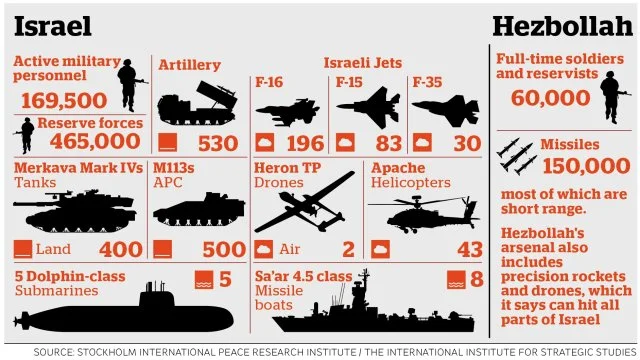 헤즈볼라의 군사력은 정확히 말해 테러리스트 성격의 이슬람 지하디스트 군사조직이 아니다. 정확히는 군벌이나 당군에 가깝다. 무장병력은 2만의 하마스와도 비교가 안 되는 수준인 6만 5천 명이며 전차, 장갑차, 드론, 미사일 등 정규군 수준이어야 굴릴 수 있는 장비들을 다 가지고 있다. 특히 사거리가 200 km에 달하는 젤잘-2 미사일 등 150,000개의 로켓과 미사일 및 원격조종이 가능한 무인항공기를 보유하고 있고 통일된 군복 체계까지 갖추고 있을 정도이다. 이 때문에 이스라엘군에게 있어서 어떤 면에서는 하마스보다 더 골치 아픈 존재가 바로 헤즈볼라인 것도 있다. 어느 누군가는 헤즈볼라에 대해 "군대처럼 훈련되고 국가처럼 장비를 갖춘 민병대"라고 지칭했는데 그 표현이 아마 가장 적합한 말일 것이다.