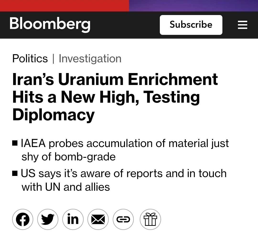 올해 초 이란의 우라늄 농축 84% 의혹에 관련된 블룸버그의 보도현재 이란은 제조 직전의 농도 83.7%에 이르는 고농축 우라늄의 입자를 보유하고 있는 상황인데 핵무기 개발 속도를 끌어올린 결과 이란이 마음만 먹으면 2주 만에 핵폭탄 1기 분량의 핵분열성 물질을 생산할 수 있는 능력에 도달했다는 IAEA의 진단까지 있을 정도이다. 참고로 실제 핵무기 제조에 사용되는 우라늄 농도가 90%인 점을 보면 거의 무기급 수준까지 오른 것이다. 이에 AP통신은 농축도가 84%에 달하는 우라늄은 이란이 마음만 먹으면 핵폭탄 하나를 곧 생산할 수 있다는 걸 의미한다고 보도하기도 했다. 물론 아직까지는 북한 정도의 보유 단계에 도달하지 못한 것은 사실이고 이란 정부도 고의로 농축된 게 아니라 의도치 않게 변동되었을 가능성도 있다며 선을 긋기도 했다. 그러나 정작 이스라엘-하마스 전쟁이 벌어진 이래 이 흐름의 배후에 이란이 있다는 의혹들이 터져나오는 것도 모자라 중동 전체로의 확전 우려까지 나오고 미국과의 대화가 잘 풀릴 가능성이 점점 낮아지고 있는 상황이라 이란은 앞으로 더 강경 반서방화에 박차를 가할 것 같다.