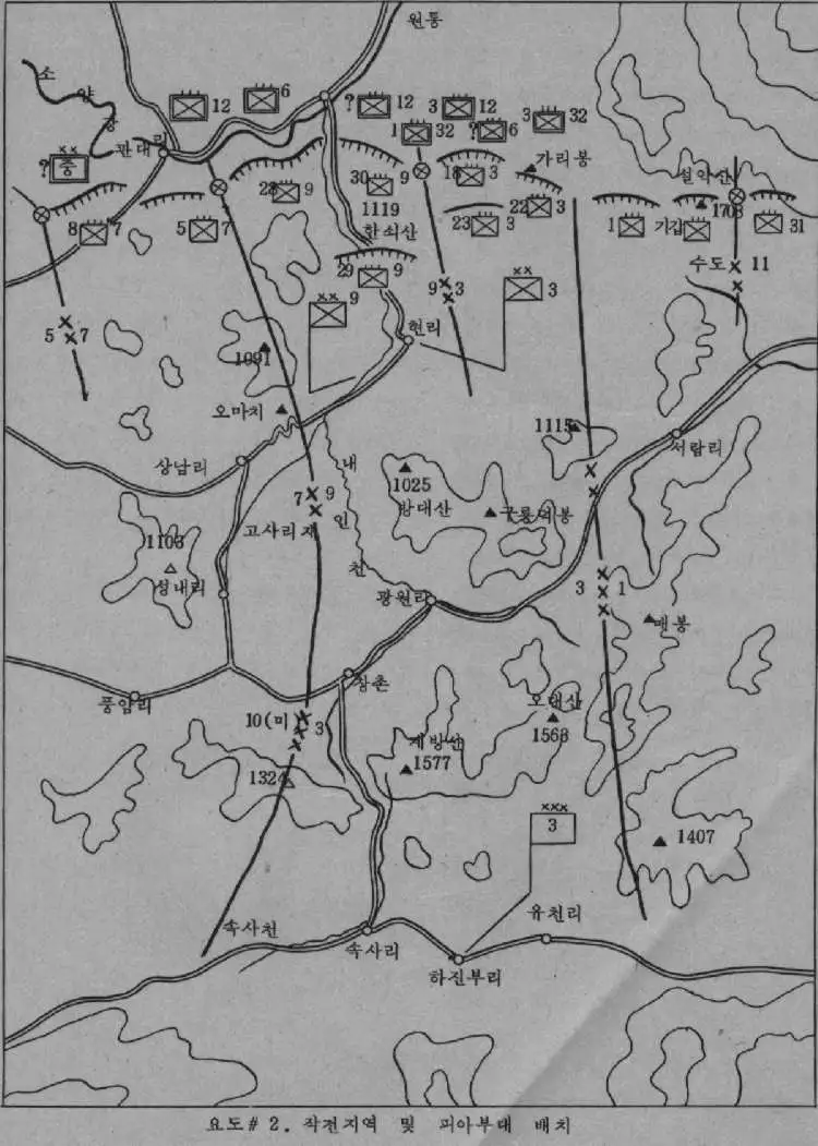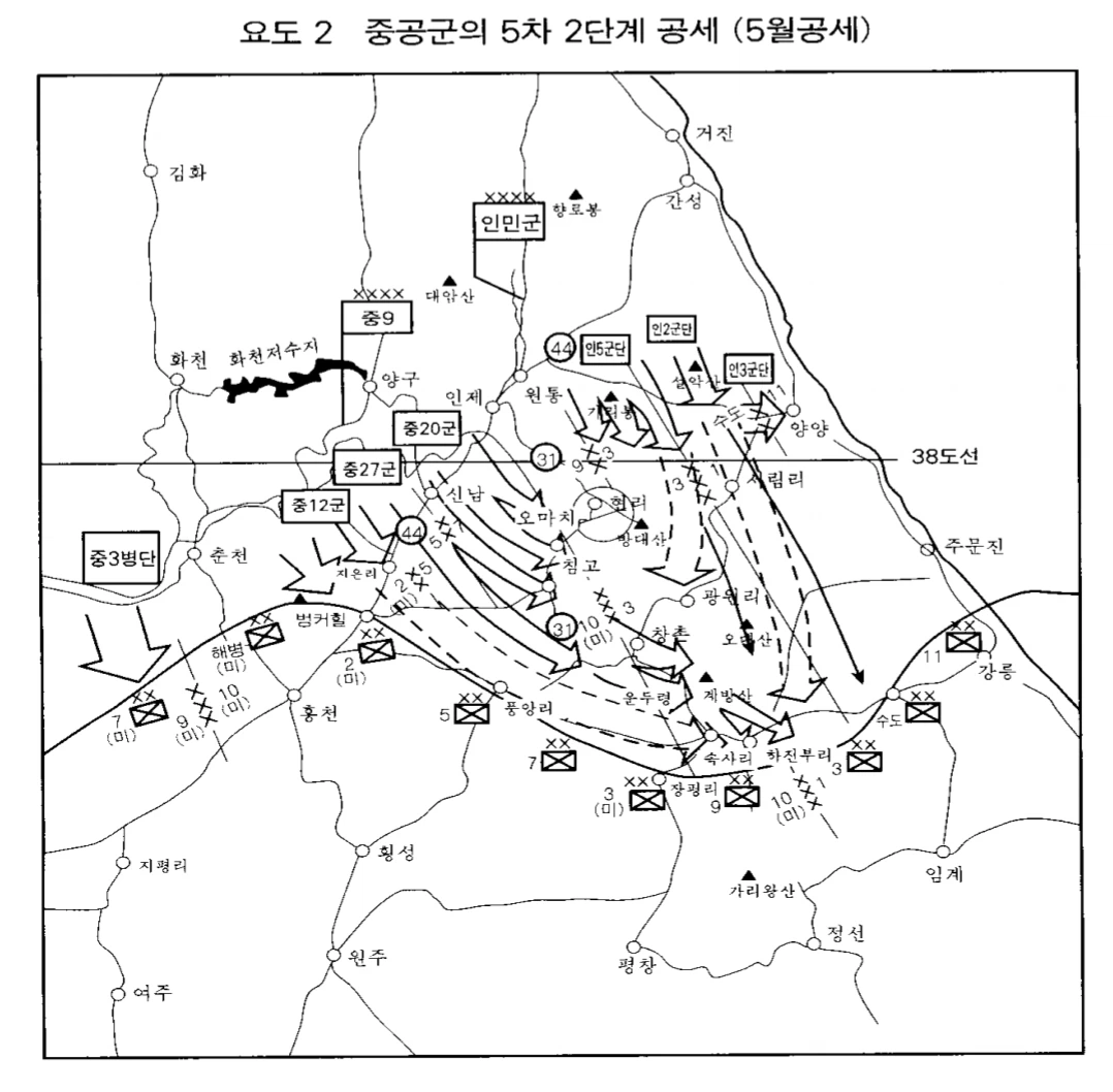 문제는 미 제8군이 공세 직전에 유엔군의 주력부대를 서부와 중앙 지대에 집중했다는 것인데 당연히 그에 따라 국군이 담당하던 동부 지역은 상대적으로 허술해졌다. 그렇지만 미 제8군은 홍천 동쪽에 위치한 북한군의 병력이 미약하고 태백산맥의 험준한 지형을 활용해 방어진지를 구축하면 국군 6개 사단이 주저항선 진지를 고수할 수 있다고 판단했다. 그렇게 굳게 믿고 있었던 탓에 대규모 중공군의 신속한 이동을 공격이 시작되기 전에 알지 못했으며 공격 당일인 5월 16일 국군 제7사단과 미 제2사단 지역으로 각각 중공군 2개 군 6개 사단이 집중될 때까지 적의 기도와 규모를 전혀 파악하지 못했다. 이런 맥락에서 이 판단이 국군 제5, 7사단이 돌파당했으며 또한 제3군단의 퇴로가 차단당하는 결정적인 계기가 된다. 당시 미 제2사단은 그래도 병력의 열세를 화력으로 극복하는 것이 가능했었지만 반대로 병력에 의존할 수 밖에 없었던 국군은 1개 사단으로 중공군 6개 사단의 공격을 저지하는 게 아예 불가능한 상태였다.