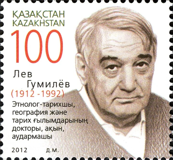 카자흐스탄에서 발행한 레프 구밀료프 기념 우표그리고 이런 원조 유라시아주의를 러시아 망명 지식인이 아닌 소련 국내에서 명맥을 이은 사람이 바로 레프 구밀료프였다. 그는 국내에 <상상의 나라를 찾아서>라는 저서가 출간된 적이 있고 2018년도에 문재인이 러시아 국가두마 연설에서 잠깐 스쳐지나가듯이 언급하기도 하면서 인지도가 한국에서도 조금 높아진 인물이기도 하다. 구밀료프는 볼셰비키에게 처형당한 아버지를 둔 사람이었는데 덕분에 일생의 상당수를 시베리아에서 유배 생활을 했어야 했다. 그렇지만 시베리아에서의 생활은 구밀료프에게 유라시아라는 공간에 대한 가능성을 심어줬고 후에 연구자가 되어 역사학, 고고학, 지리학 등 다양한 학문 분야를 섭렵한 그는 러시아의 기원들은 아시아와 유목민족들에서 발견된다는 주장을 증명하려는 여러 저서들과 논문을 집필하기도 했었다. 또한 구밀료프는 오직 러시아만이 유라시아의 강대국으로서 살아남으리라고 보았지만 정작 특유의 아시아 지향적인 접근법 탓인지 러시아 정교회, 소련 공산당, 국수주의자들의 반감을 모두 사게 되었다.