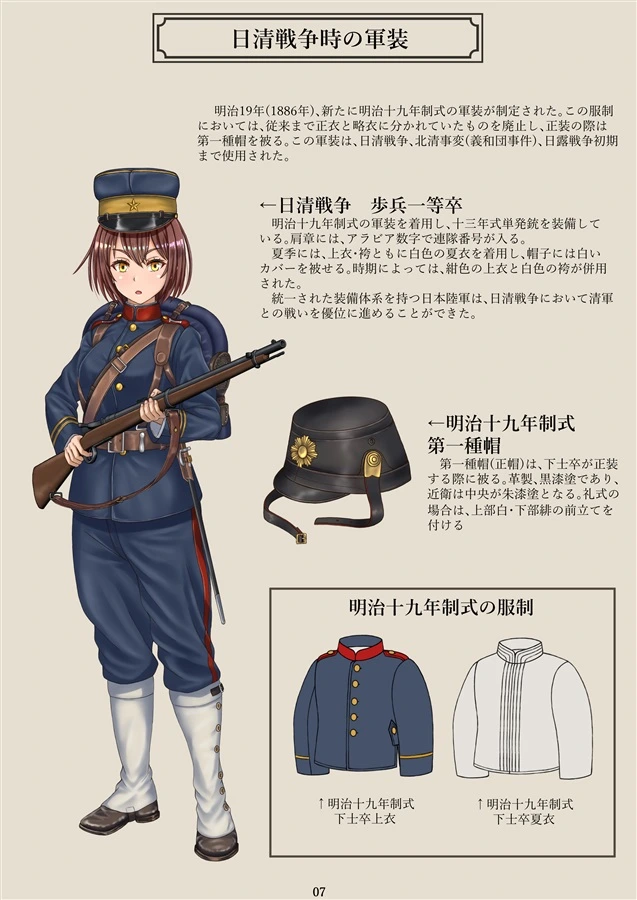 메이지 시대 일본군 군복(출처: 大日本帝国陸海軍 軍装の変遷~歩兵・海軍陸戦隊編~)사단은 기존의 진대와는 달리 담당 지역을 방어하는 것이 아니라 1개의 전략 단위로서의 기동성이 더 강조되었다. 이는 명백히 대외 전쟁에서의 전투를 염두에 둔 조직 개편이었다. 일본 육군의 상설 사단은 청일전쟁이 시작되었던 1894년에 제1사단부터 제6사단과 근위사단을 합쳐 7개 사단을 이루어 일본 군대의 주력을 형성하게 되었다. 국가예산(일반회계)에서 군사비가 차지하는 비율의 경우 1868~1877년까지는 평균 15.9%였지만 이후 확장되면서 1878~1882년까지는 평균 17.3%로 상승했다. 1883년 이후로는 20% 이상이 되었고 해군력도 점차 근해의 제해권 확보를 중심으로 재편되었다. 결과적으로 1888년부터 1832년까지 5년간의 군사비 비율은 평균 28.2%에 달하는 수준이 되었다.