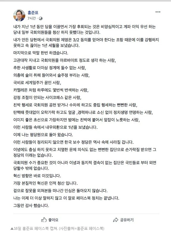 " 내가 지난 1년 동안 당을 이끌면서 가장 후회되는 것은 비양심적이고 계파 이익 우선 하는 당내 일부 국회의원들을 청산 하지 못했다는 것입니다.