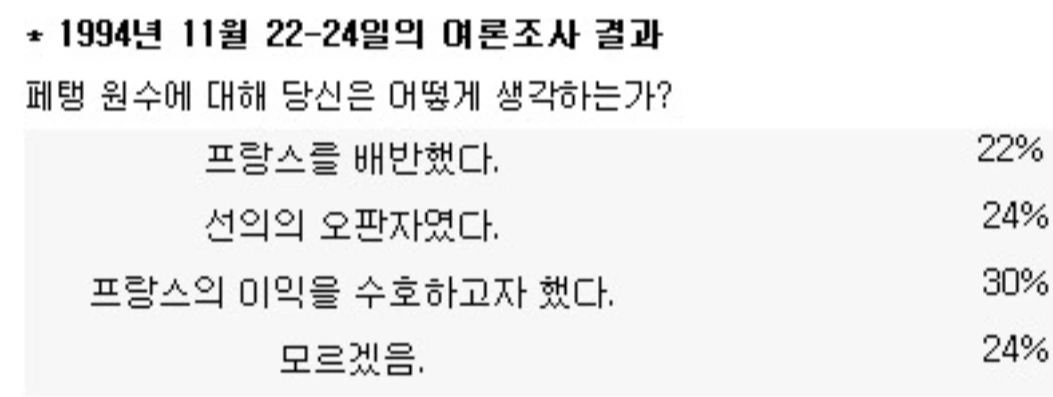 그리고 오늘날에 이르며, 이 당시 프랑스의 과거 청산에 대한 회의 여론이 다름 아닌 프랑스 국내에서 생겨나고 있다. 1945년 당시에는 페탱을 법적으로 처벌해야 한다는 여론이 압도적으로 우세했지만 이 수치는 1950년대 이후 계속 하락하면서 1983년에는 31%가 처벌이 잘못되었다는 쪽, 또 다른 31%는 중립이 나왔다. 1994년 11월 조사에서 페탱 원수에 대한 평가는 프랑스를 배반했다는 의견이 22%, 선의의 오판자였다는 의견이 24%, 프랑스 이익을 수호하고자 했다는 의견이 30%로 나오며 점점 그에 대한 재평가가 진행되고 있는 추세에 있다. 물론 그럼에도 2018년 마크롱 대통령이 페탱 원수를 영웅이라 치켜세우는 발언을 했을 당시에 프랑스 국내에서 논란이 일어나는 등 여전히 비시 프랑스 문제로 반감을 가진 사람도 적잖게 있지만 과거에 비하면 이것도 많이 나아진 것이다.