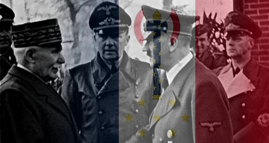 페탱 원수와 히틀러한동안 프랑스인들이 기억에서 지우고 싶어 했던 흑역사인 비시 프랑스는 1940년 6월 패전에서 출발했다. 6주 만에 심각한 패배 위기에 몰린 프랑스는 1차 세계대전의 영웅이던 페탱을 중심으로 하여 내각을 구성하고 정식으로 "휴전"을 맺고 전쟁을 끝냈다. 이 휴전협정으로 프랑스 영토의 북부 절반 이상이 독일군의 점령에 들어갔고 그래서 남부의 프랑스 정부의 수도는 비시가 되어 "비시 프랑스"로 불리게 되었다. 그러나 비시 프랑스는 세간의 인식과는 달리 일반적인 괴뢰 정권과는 성격에서 좀 차이가 있었다. 물론 괴뢰 정권과 달랐다고 해서 온전히 주권을 행사하거나 나치에 협력하지 않았음을 의미하는 것은 아니다. 단지 처음부터 끝까지 협력했고 주권을 점점 잃어가는 쪽이었다.