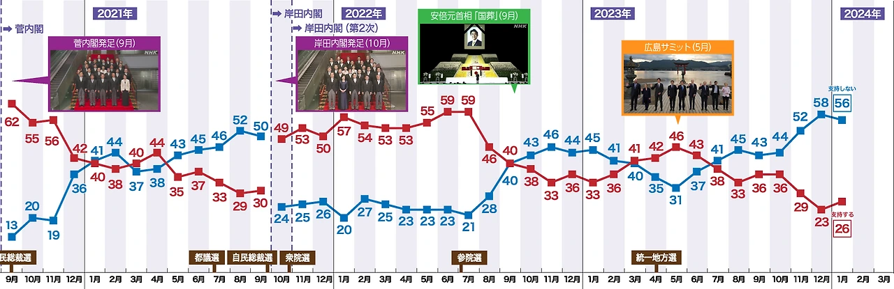 아무튼 이번 자민당 정치자금 스캔은 올해 9월에 예정된 차기 총재 선거의 향방에 커다란 변수로 등장할 가능성이 높으며 비록 정권교체 그런 거는 없겠다만 안 그래도 하락세인 기시다 내각의 지지율을 계속 밑으로 박게 만드는 건 가능하지 않을까 싶다. 결국 "새로운 자본주의"를 앞세운 채 제2의 이케다 하야토를 꿈꾸며 야심차게 총리직에 선출된 기시다 후미오였지만 그 끝은 자민당의 흑역사인 모리 요시로나 미야자와 기이치가 맞이 했던 파국을 향해 가고 있는 중이다. 이 정도로 일본에서 평가가 안 좋은 총리는 굳이 찾아봐야 소비세 개판치고 아베한테 정권내준 노다 요시히코나 동일본 대지진 및 후쿠시마 원전 사고가 있었던 간 나오토, 그냥 재앙 그 자체인 아소 다로랑 하토야마 유키오 정도가 끝일텐데 이런 상황이다 보니 차라리 스가 요시히데를 재평가하게 되는 것 같다.