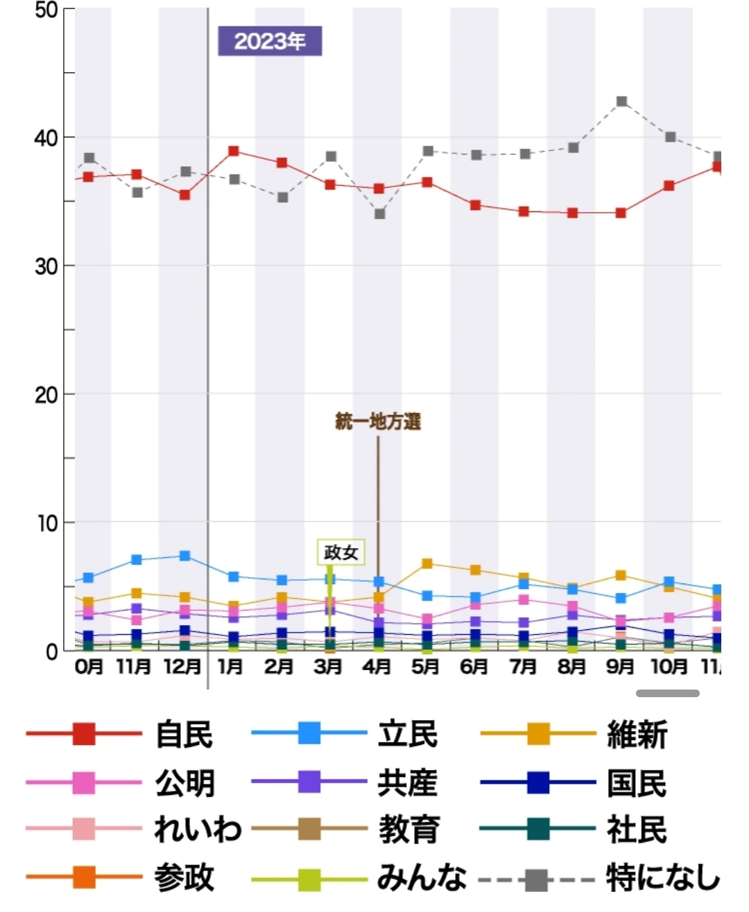 국내 일각에서는 이번 스캔들 덕분에 일본 야당이 정권교체에 성공하여 자민당 일당 독주를 끝낼 수 있을 것이라는 기대도 조금 나오는 것 같던데 당연히 불가능하다. 그게 진작에 가능했으면 2018년 모리토모 스캔 때 아베는 쫓겨나고도 남았을 것이다. 일본 정치사에서 자민당이 정권교체 당한 사례는 1993년과 2009년으로 총 2번이었는데 둘 다 부패 문제 때문에 무너졌다기보다는 경제 문제가 결정적인 이유였다. 1993년도는 이미 거품경제의 붕괴로 본격적인 불황이 가속화되는 시기였기에 사가와규빈 스캔은 그냥 기름 붓는 역할 정도였고 2009년도는 잃어버린 20년이 아베(1차)-후쿠다-아소로 이어지는 고이즈미 이후의 자민당 내각들의 미숙함으로 인해 경제난이 심해져서 메니페스토, 생활 정치를 앞세운 민주당에게 총선에서 패해 무너진 사례였다. 한마디로 일본에서 정권교체의 가장 큰 특징은 경제적인 것에 초점이 맞춰져있다.