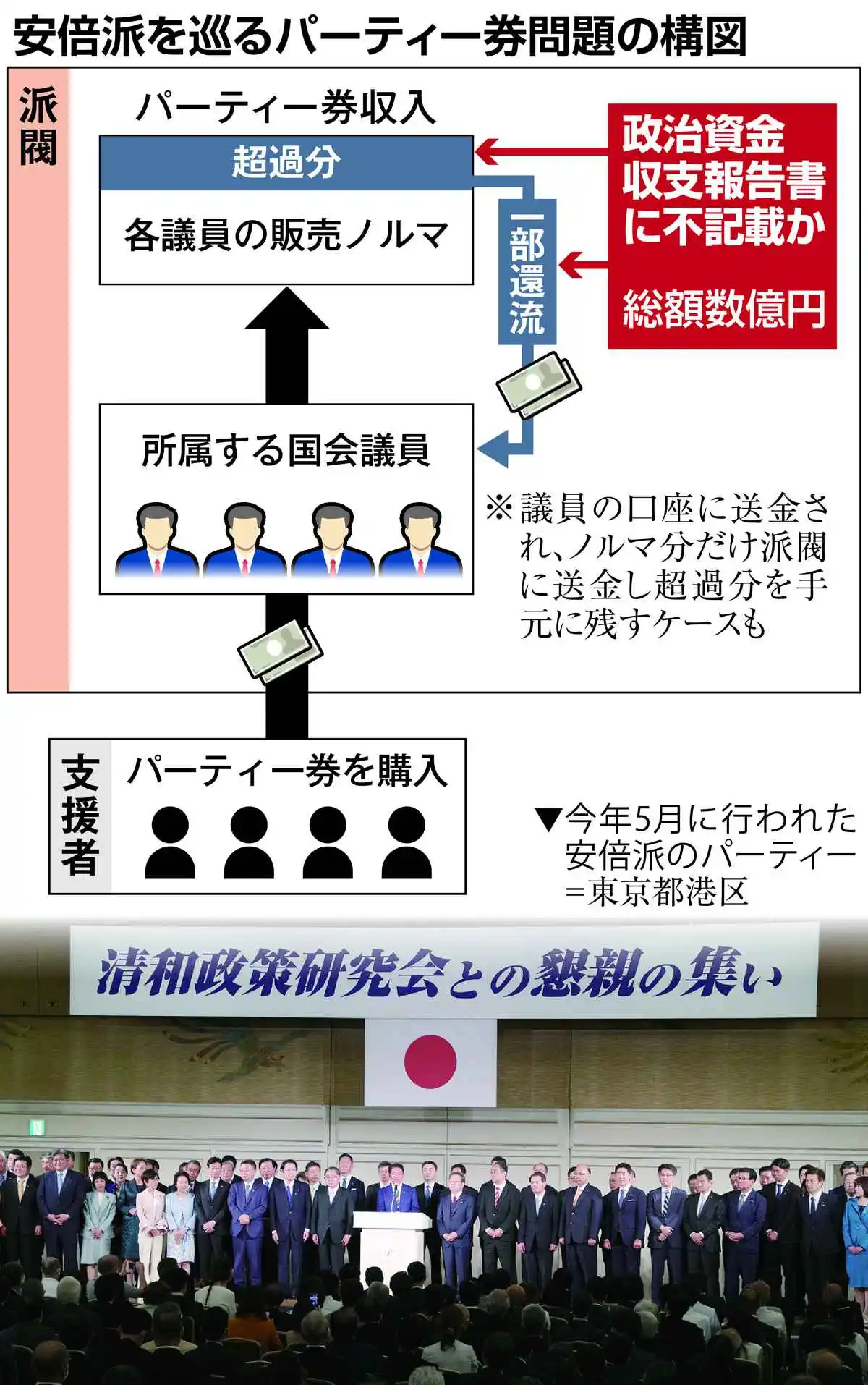사건의 발단을 잠시 대략적으로 설명하자면 이때까지 자민당 5대 파벌은 매년 정치자금 모금 행사를 하면서 각 의원들이 2만엔의 파티 입장권을 50장씩 의무 판매하였고 여기서 초과 금액을 본인이 가져갈 수 있게 했던 방침에서 비롯된 것이었다. 그러니까 의무 판매 분량을 넘어서 초과분을 팔고 나면 초과한 판매 분량은 본인이 가져가는 구조인데, 문제는 일본 공산당의 매체인 "아카하타"에서 2022년 이 의혹을 제기하여 문제삼기 시작한 것이었다. 아카하타는 2018년부터 2020년까지 3년간 불기재된 이름들이 59명, 자금들만 무려 2422만엔에 달한다고 보도하였으며 이중 불기재 금액이 가장 높았던 파벌로 알려진게 바로 아베파인 세이와 정책연구회였다.