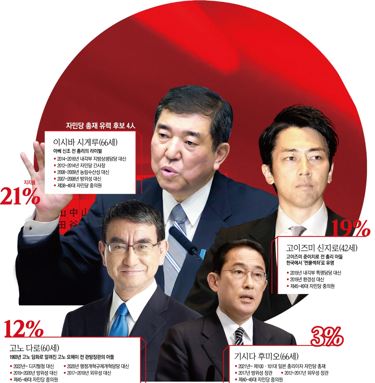 우선 이시바 시게루는 여론조사에서는 압도적인 인기를 얻지만 문제는 당내에서 인기가 거의 없다는 것이다. 한반 탈당했었던 이력 탓인지 그에게는 배신자라는 이미지가 계속 발목을 잡고 있는 상황이고 이 때문에 아베 집권기 동안 그의 아성을 넘보지 못했었다. 고노 다로도 비슷한 케이스로 대중적인 인기는 높지만 당내 기반이 부족한 경우인데 무엇보다 마이넘버 사태 당시 디지털 대신 자리에 있던 특성상 역량에 대한 의구심도 있는 편이다. 파벌 정치가 지금 표면적으로나마 자진 해산 분위기 속에서 와해되는 분위기라고 해도 파벌에 소속되었던 의원들의 힘은 여전히 막강한지라 마음만 먹으면 얼마든지 파벌의 재구성이 가능한 상태라서 여전히 고노나 특히 이시바는 당내에서 지지받기 좋은 조건이 아니다.