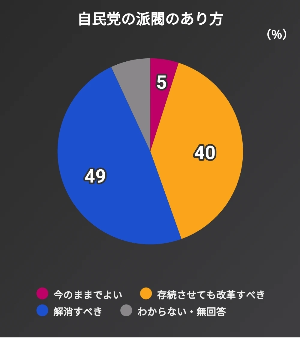 NHK 2024년 1월자 자민당 파벌 관련 조사 결과. 지금 그대로가 좋다는 의견은 단 5%에 불과했다.