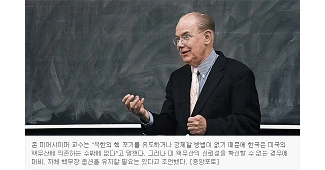 작년 8월 통일부 주최로 열린 행사에 공격적 현실주의 국제정치학의 대부인 존 미어샤이머 교수는 그 자리에 참석하여 "북한의 핵보유가 한반도에서 미중 간 직접적인 대립을 최대한 멀어지게 하고 있다"고 발언했다. 원래부터 미어샤이머 교수는 한반도 비핵화 해법의 가능성에 대해 지속적으로 회의적인 의견을 보여왔던 만큼 그다지 놀라운 일은 아니지만 아직까지도 북한을 비핵화시킬 수 있다고 믿는 사람들이 다수인 한국 사회에서는 받아들이기 힘든 주장일 것이다. 그렇기에 우리나라는 그동안 보수 정권이든, 민주당 정권이든 비록 강경책, 유화책 사이에서 방법론적 차이가 있었을지언정 북한을 반드시 비핵화시킨다는 강박적인 목표 하나는 동일했었고 그 결과가 지금 오늘날의 한반도 정세를 초래하게 되었다.