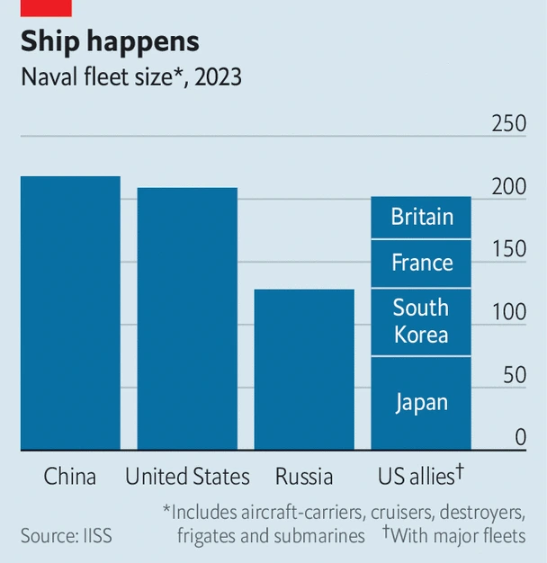 그러나 서구 열강에 있어서 걱정해야 할 점이 있다면 그런 우위의 격차가 조금씩 줄어들고 있다는 부분이다. 중국 해군의 선박 건조 속도 및 능력은 갈 수록 향상되고 있지만 미국은 계속 시들어가고 있는 추세다. 동시에 나토 체제 하에 편입되어 있는 유럽 해군은 1999년부터 2018년 사이에 잠수함의 28%, 호위함 및 구축함의 32%를 감축하여 이전 모습보다 더 퇴보한 상태다. 작년인 2023년 전 세계 선박의 평균 일일 수입을 측정한 ClarkSea라는 조사기관에 따르면 10년 전보다 33% 증가 및 해상 무역은 3% 증가한 124억 톤에 이르렀고, 글로벌 조선업은 10% 증가했는데 여기서 중국은 처음으로 글로벌 조선업의 생산량의 절반 이상을 차지했다. 아무리 보호무역주의가 확산되고 있다고 하더라도 세계 무역의 약 80%가 해상을 통해 이루어지는 만큼 이는 분명 위협적이라 할 만한 면모다.