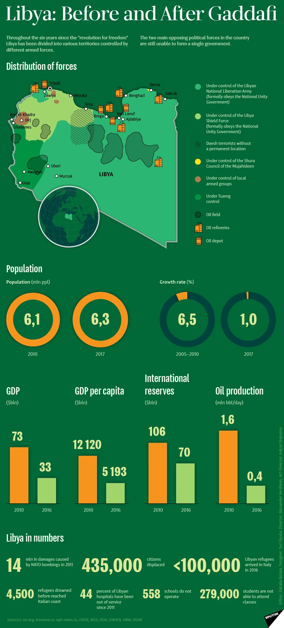 카다피 이후 리비아의 상황은 오랫동안 그가 집권했을 때보다 훨씬 최악으로 흘러갔다. 아랍의 봄은 자연스럽게 민주화로 이행될 것처럼 보였지만 현실은 리비아를 구성하던 각 부족들의 이권 다툼에 군벌화로 이어지며 나라가 쪼개졌고 그 사이를 틈 타 미국과 프랑스, 이탈리아, 러시아, 중국 등 다양한 강대국들이 이권을 위해 관여하면서 훨씬 개판이 되어버렸다. 결국 국민통합정부를 표방하는 이슬람 원리주의 세력이 튀르키예와 일부 유럽연합 회원국들, 미국, 카타르의 지지 하에 서부지역 트리폴리에 단독정부를, 리비아 국민군이라는 세속주의 군부세력이 러시아 및 바그너 그룹과 사우디의 지지를 받아 동쪽 지역 투브루크에 단독정부를 세우게 되며 나라가 쪼개지는 내전에 빠져들었고 다행히도 2020년을 기점으로 양 세력은 휴전을 맺었음에도 여전히 분열이봉합되지 못했다.