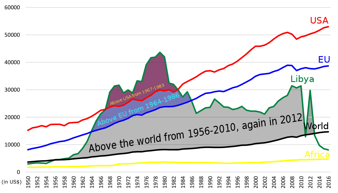 카다피 시절 리비아의 1인당 GDP는 한동안 유럽연합보다 높았었다. 이후에 하락한 것은 반미 노선에 따른 경제제재 때문이고 해제 이후 다시 상승했다가 내전으로 파탄났다.