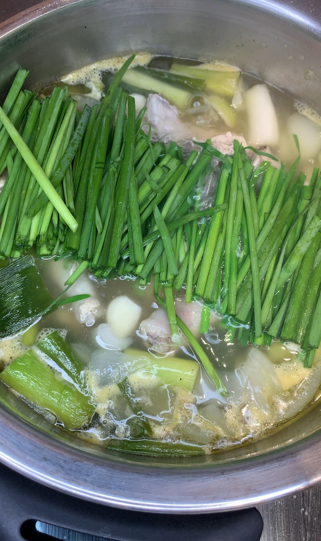 2. 1.5리터의 물에 닭, 손질한 채소, 치킨스톡, 맛술, 코인육수를 넣고 중불에서 25분 정도 푹 끓입니다.