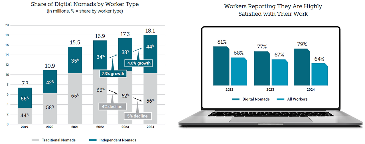 그리고 이러한 글로벌 디지털노마드들은 높은 만족도를 기반으로 현재 미국 전체 노동력의 11%인 약 1,810만 명에 달하며 2026~2027년 약 4,200만 명으로 예상되고 있다.