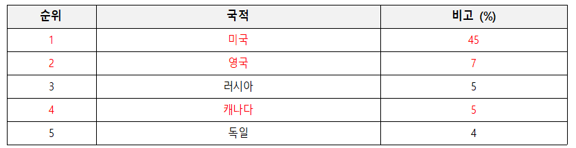 그리고 이들의 국적을 조금 더 분석해 보자면 영어권 국적이 약 57%를 차지하고 있음을 알 수 있다.
