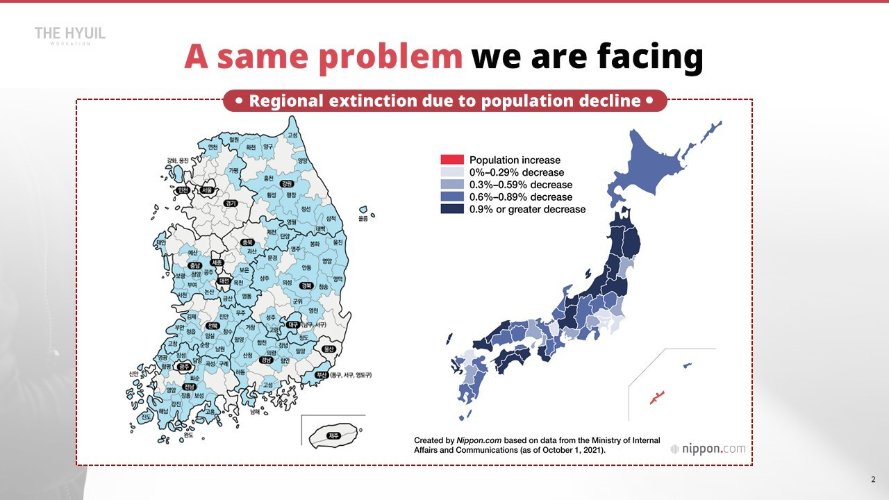 한국과 일본은 ”인구감소에 따른 지역 소멸”이라는 공통된 사회적 문제에 직면해 있다. 그리고 이에 대한 해법을 찾기 위해 생활인구를 확대할 수 있는 방안을 모색하고 있는데 이를 위한 가장 실질적인 전략이 바로 워케이션이 될 수 있으며 실제 우리의 B2B/B2G 워케이션 모델을 통해 지역의 주중/비수기 생활인구 확대 및 지역 소비 증진이라는 결과를 가지고 오고 있기에 일본 정부 및 지자체 입장에서 워케이션에 대한 니즈가 분명히 있을 수 있다고 판단한다. 즉, 우리의 한국에서의 성공적인 워케이션 모델을 일본에 도입할 수 있다면 한국과 일본이 공통적으로 직면하고 있는 인구감소에 따른 지역 소멸 문제를 함께 해결해 나갈 수 있을 것이고 이는 사업적으로 기회를 만들 수 있을 것이라고 생각한다.