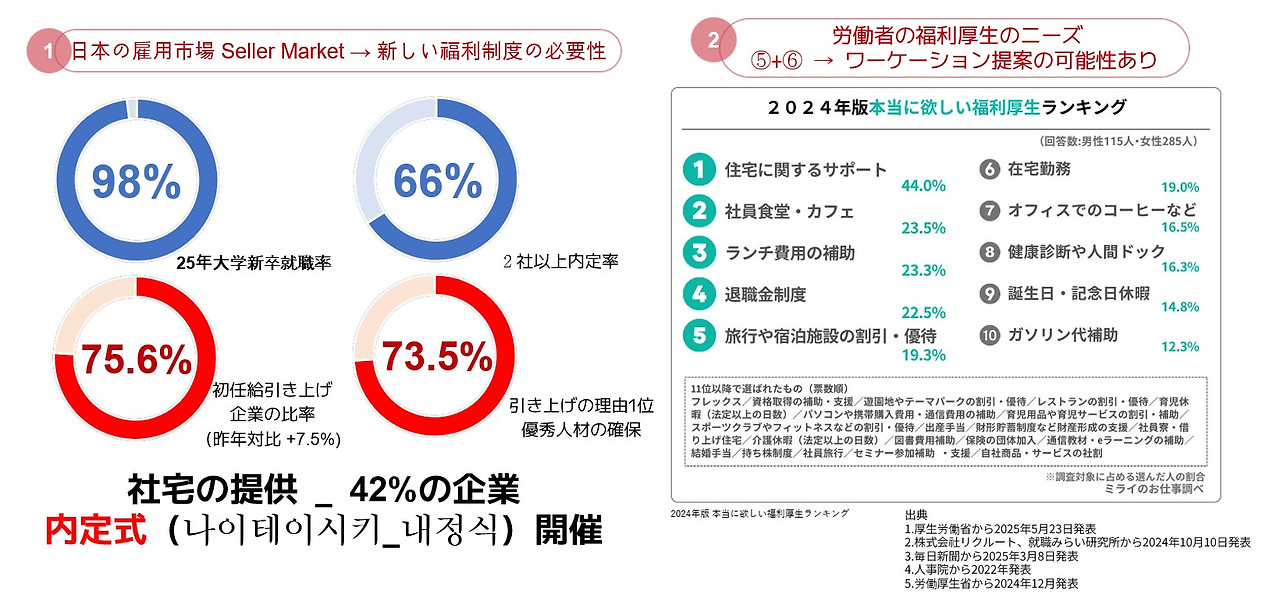한국과 일본은 "보수적"이라는 유사한 근로 문화를 가지고 있으며 특히 현재 일본의 취업시장에 있어 구직자 중심의 “Seller Market”에 형성되어 있기에 기업들은 우수한 인재를 채용하기 위해 다양한 복지 정책을 지원하고 또한 새로운 정책들을 만들어 내야 한다. 한국 대한상공회의소에서 조사한 설문 조사에 따르면 워케이션 도입을 희망하는 근로자는 10명 중 9명에 달하며 재도입 희망 비율은 95%에 달할 정도로 워케이션은 한국에서 근로자가 가장 선호하는 복지 정책이자 근로 문화로 자리매김하고 있다. 아직은 분명 일본 기업들에게 워케이션이라는 근로 문화 및 복지가 낯설겠지만 우리의 성공적인 B2B 워케이션 모델을 잘 전파해 나간다면 분명 일본 기업들의 도입 니즈가 있을 것이라 확신한다. (예를 들면 2024년 일본 근로자들이 선호하는 복지 제도 설문 조사 중 5번(여행 지원)과 6번(재택근무)을 워케이션으로 연결한 새로운 복지/근로문화 제안 등)