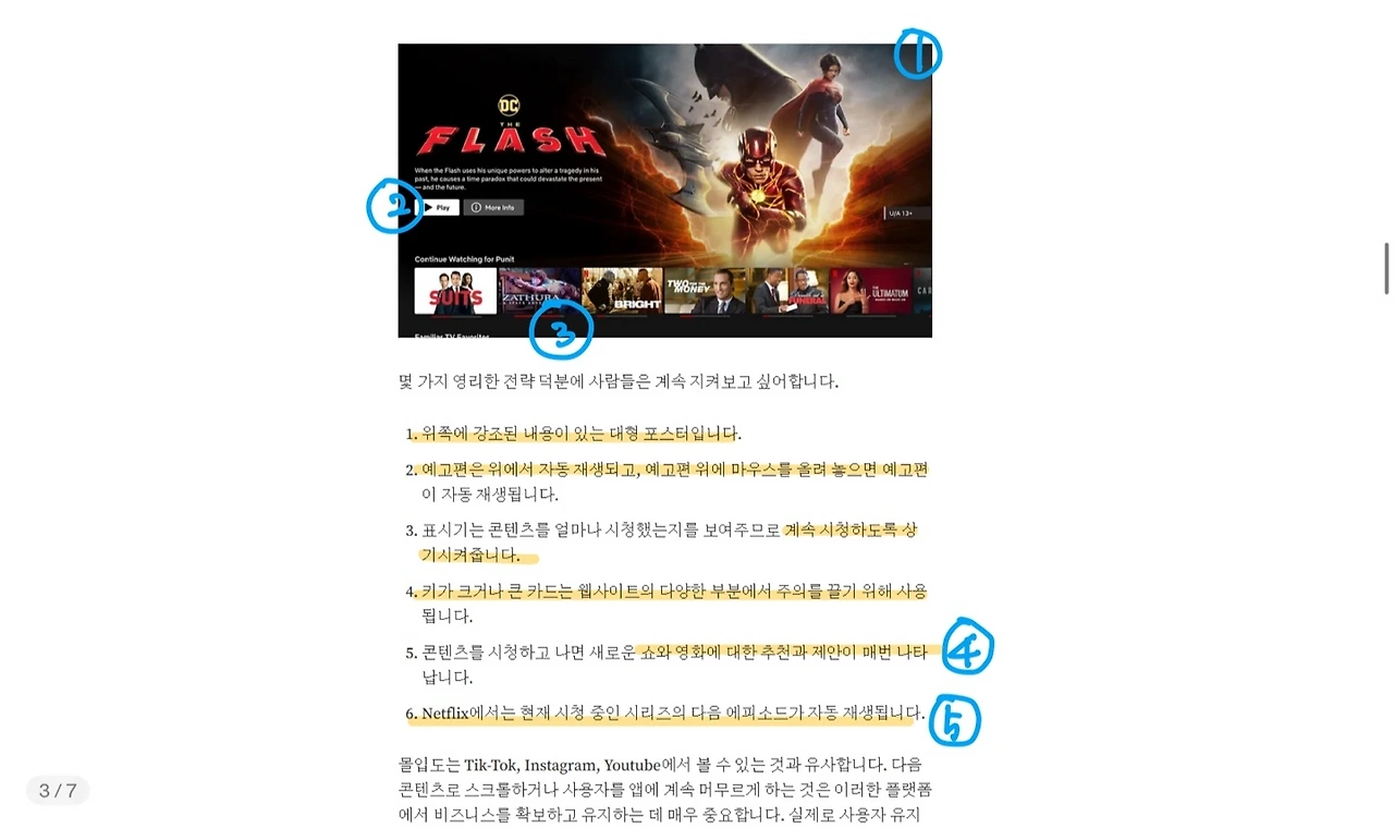 상단에 강조한 대형 포스터, 마우스를 호버하면 자동으로 재생되는 영화, 얼마나 시청했는지 알려주는 상태바, 콘텐츠 시청이 끝나면 관련 영화 추천, 현재 시청 중인 시리즈의 다음 에피소드