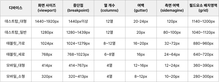 - 필드요소 배치영역: 제목, 본문 텍스트, 이미지 등 레이아웃에 얹을 요소들을 배치하는 영역을 말함. 그리드영역을 의미하는 것임. 콘텐츠를 정렬하고 배치하기 위한 가이드라인 '영역'임. 계산 방법은 (열 너비 × 열 수) + (거터 너비 × (거터 수) 이때 거터 수는 열보다 하나 적으니까 (열 너비 × 열 수) + (거터 너비 × (열 수-1)로 계산해도 됨.