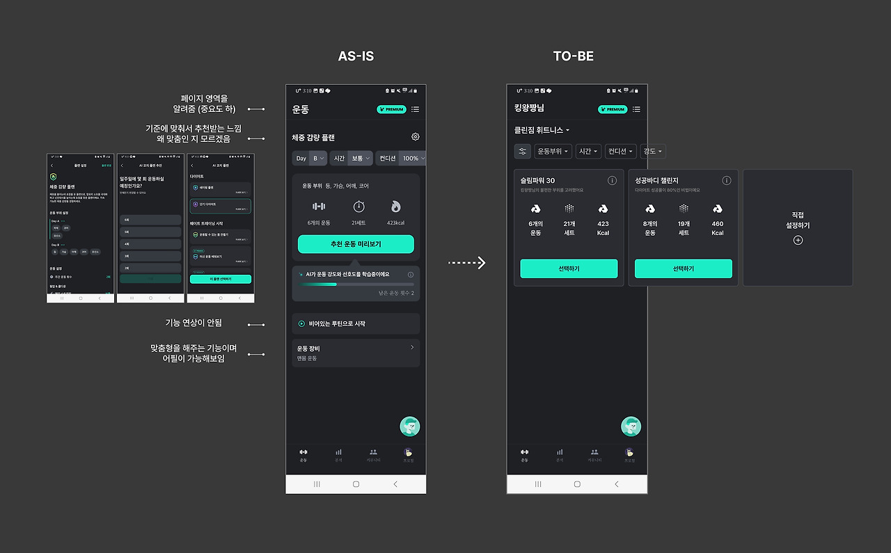 맞춤형이란? 사용자의 특성, 상황, 선호에 맞게 제작한 형태를 의미함. 기존에는 온보딩 과정에서 고정된 선택지를 바탕으로 플랜을 추천해줬음. 그러나 제한적인 구성과 기준에 맞춰진 플랜은 맞춤 느낌을 제공하기에 다소 아쉬운 부분이 있었음. 따라서, 기존의 구성을 따라가되 필터칩으로 유연하게 변경할 수 있는 구성을 제공함. 모두에게 같은 고정적인 플랜을 주는 것이 아닌 그 날의 상태에 따라 강도, 부위 등을 맞춤 변경할 수 있도록 선택지를 더욱 다양화 하는 것임. 다이어트 목적이더라도, 웨이트로 변경도 해보면서 목표를 달성하되 유연성을 조금 더 부여넣고자 함.