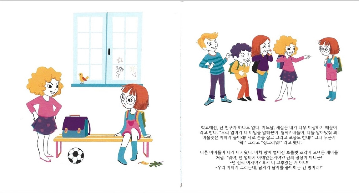 그림책의 첫 장면은 학교에서 비올렛이 세실을 비롯한 다른 아이들에게 괴롭힘을 당한다. 충분히 모욕적이다. 세실은 자기 엄마한테 비올렛 아빠들의 이야기를 들었다면서 비올렛을 놀리기 시작한다. 두 아빠가 손을 잡고 포옹한다고 말이다. 옆에서 다른 아이들은 웩 웩 거리며 ‘징그럽다’ 고 한다. 심지어 비올렛에게 진짜 엄마가 없냐고도 한다. 비올렛이 정말 여자가 맞냐고도 묻는다. 남자가 남자를 좋아하는 것은 ‘병’이라고 일갈한다. 최악이다. 그러나 세실을 비롯한 아이들의 괴롭힘이 어디에서 비롯되고 있는지 생각해 볼 일이다. 때문에 이 그림책은 비올렛을 괴롭히는 데 앞장섰던 세실을 나쁜 아이로 만들지 않는다.