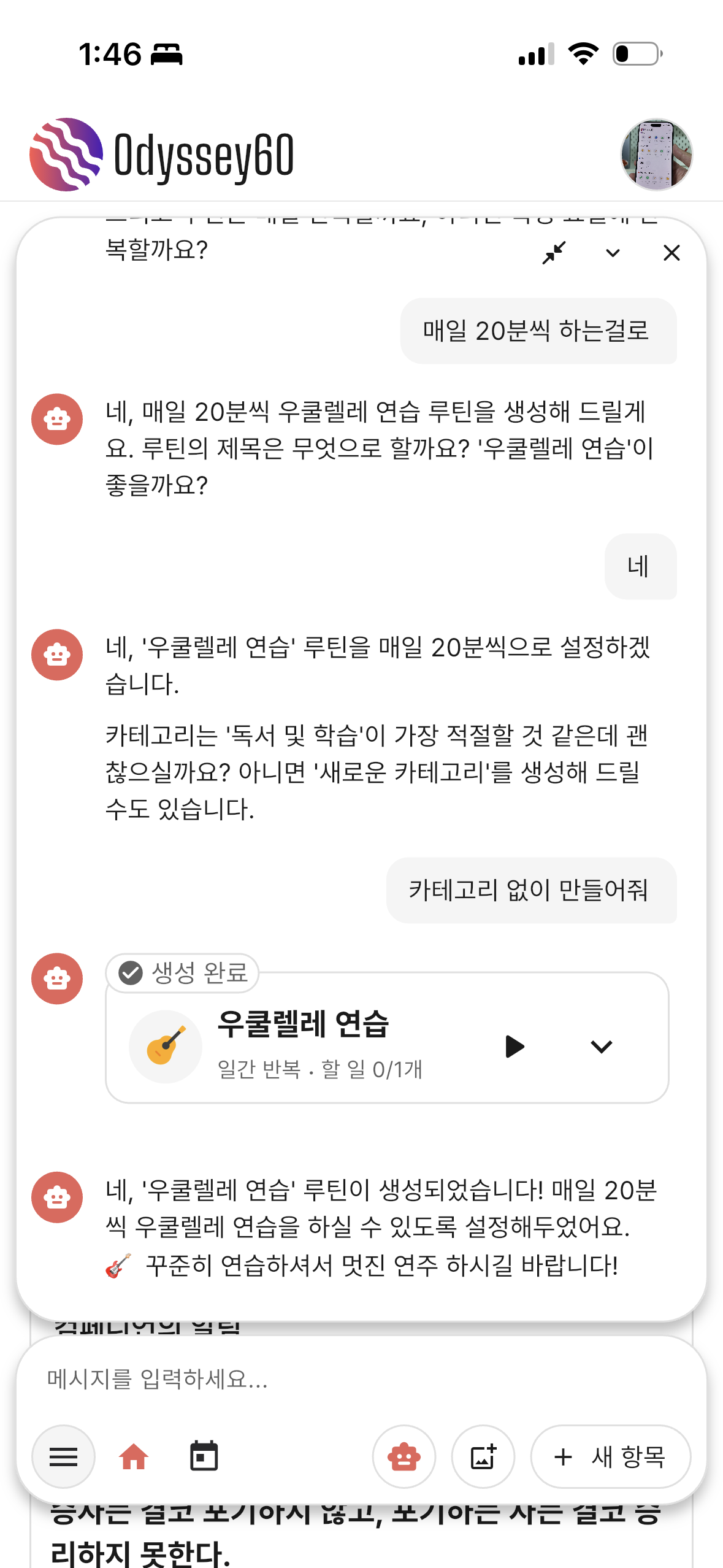 앱을 열면 먼저 말을 건다. "오늘 루틴 중에 아직 시작 안 한 게 있어요." 특정 시간이 되면 서버에서 알림을 보낸다. "어제 계획했던 거, 오늘도 이어갈까요?" 대화를 통해 목표를 잡으면 항목을 직접 만들고, 알림을 예약하고, 다음에 확인하러 다시 찾아온다.