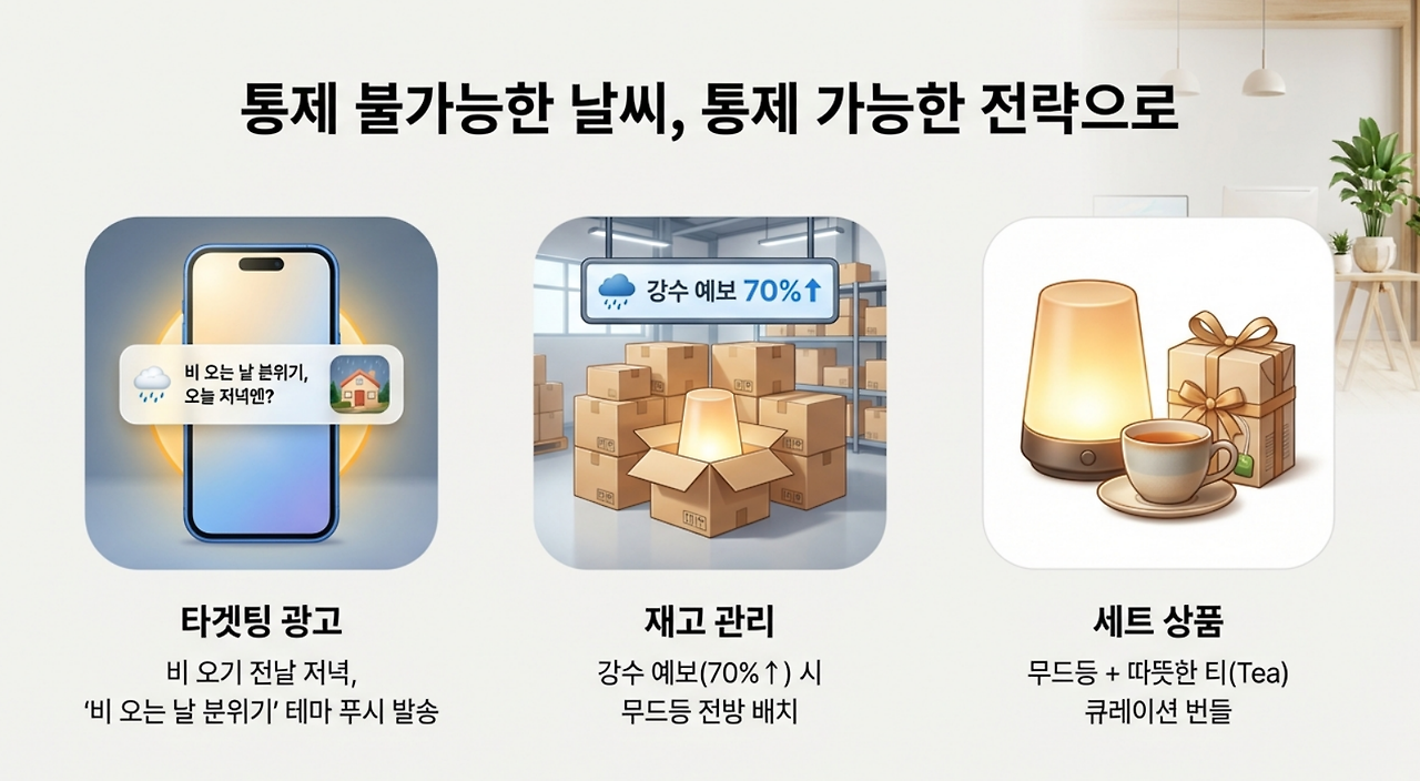 2. 재고 관리: 강수 예보에 맞춰 무드등 재고를 전방 배치하고, 배송 준비 인력을 미리 세팅.