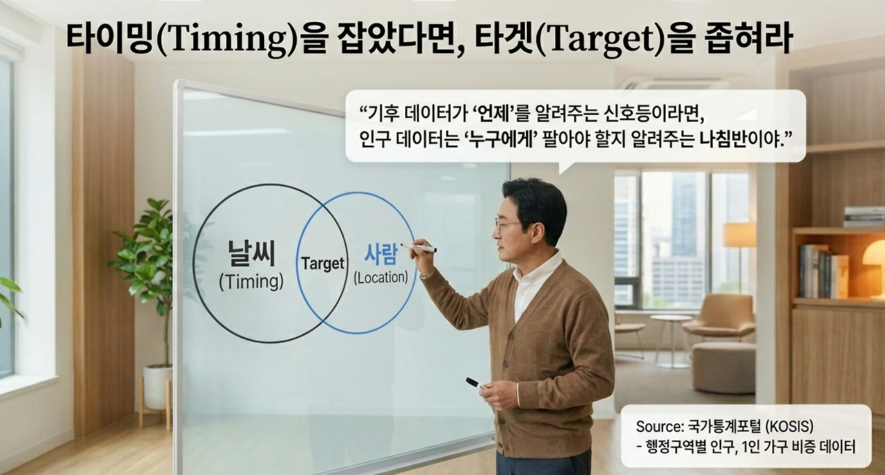 박 선배: "정답이야! 기후 데이터로 '비 오는 날'이라는 타이밍을 잡았다면, 인구 데이터로는 '1인 가구 밀집 지역'이라는 장소를 잡는 거지. 이게 바로 데이터 경영의 입체 분석이야."