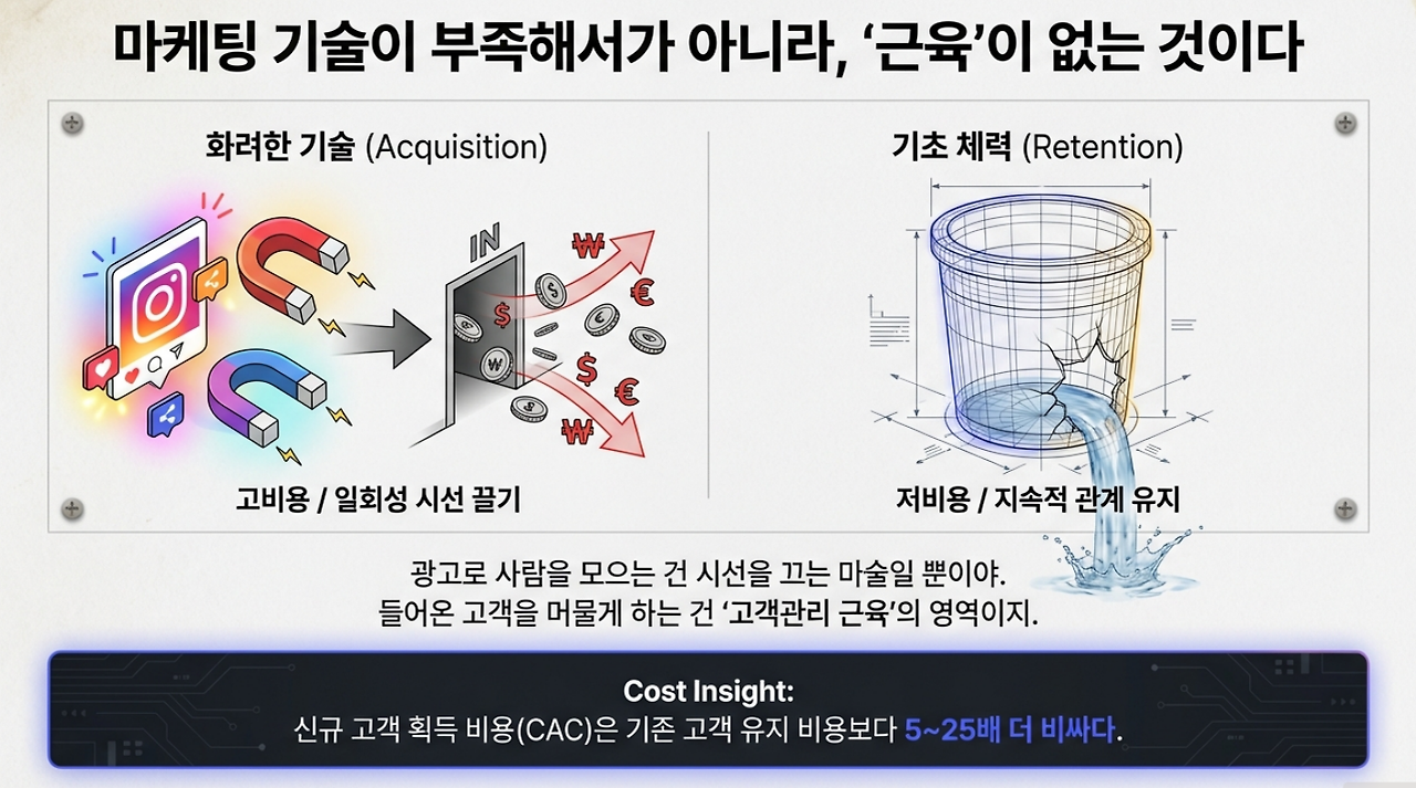 이건 마케팅을 잘 못 해서가 아니라, 들어온 손님을 대접하고 관리할 '고객관리 근육'이 없다는 뜻이야”.