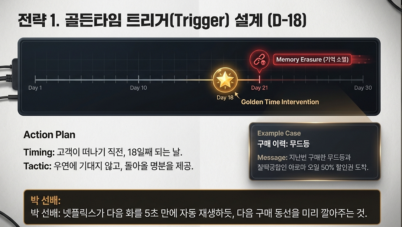 박 선배: "그럼 이제 뭘 해야겠어? 21일이 되어 고객이 영영 떠나기 직전, 골든타임인 18일째에 강력한 '트리거(Trigger)'를 던져야지."