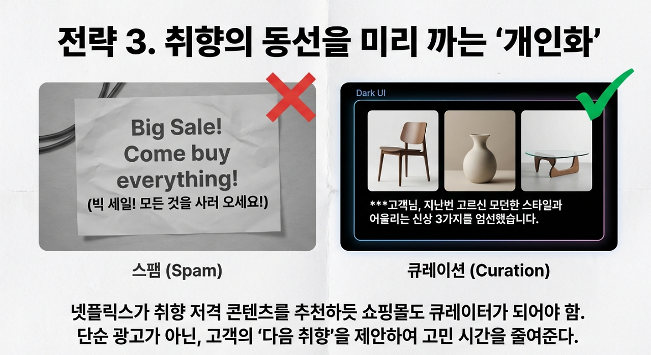 라는 메시지를 던지는 거야. 넷플릭스가 취향 저격 콘텐츠를 끊임없이 추천하듯, 고객의 다음 취향 동선을 미리 깔아주는 거지."