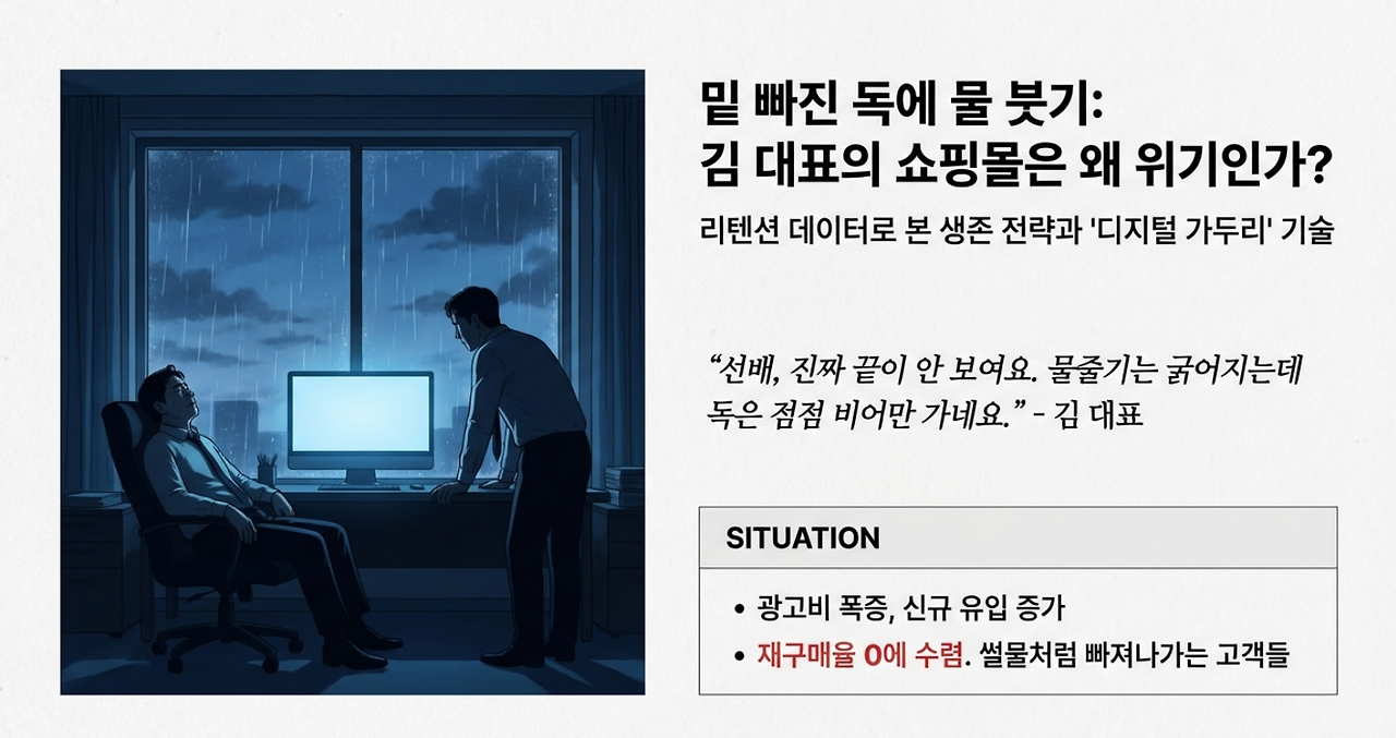 김 대표: "선배, 진짜 끝이 안 보여요. 지난번 기상 데이터 마케팅으로 대박 났던 건 한때였나 봐요. 인스타그램 광고 단가는 하루가 다르게 치솟는데, 그렇게 비싸게 모셔온 고객들이 약속이라도 한 듯 딱 한 번 구매하고 사라져요. 밑 빠진 독에 물을 붓고 있는 것 같아요. 물줄기는 굵어지는데 독은 점점 비어만 가네요."