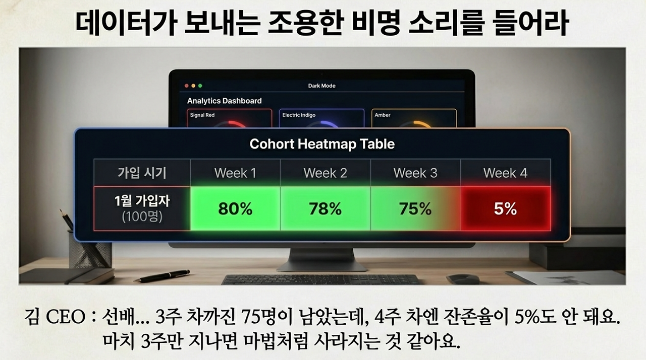 김 대표: "선배... 이거 보세요. 1월 가입자 100명 중에 1주 차에 80명이, 3주 차까지는 75명이 유지되다가 4주 차엔... 5명, 잔존율이 5% 밑으로 떨어지고 있어요. 매달 거의 같은 패턴인데요. 마치 3주만 지나면 마법처럼 사라지는 것 같아요."