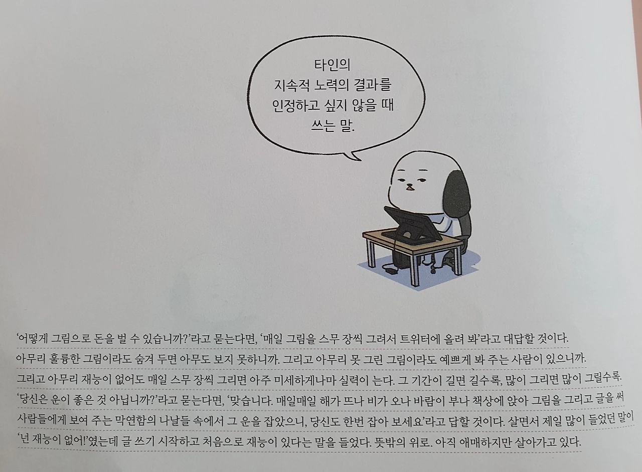 '어떻게 그림으로 돈을 벌 수 있습니까?'라고 묻는다면, '매일 그림을 스무 장씩 그려서 트위터에 올려 봐'라고 대답할 것이다. 아무리 훌륭한 그림이라도 숨겨 두면 아무도 보지 못하니까. 그리고 아무리 못 그린 그림이라도 예쁘게 봐주는 사람이 있으니까. 그리고 아무리 재능이 없어도 매일 스무 장씩 그리면 아주 미세하게나마 실력이 는다. 그 기간이 길수록, 많이 그리면 많이 그릴수록.