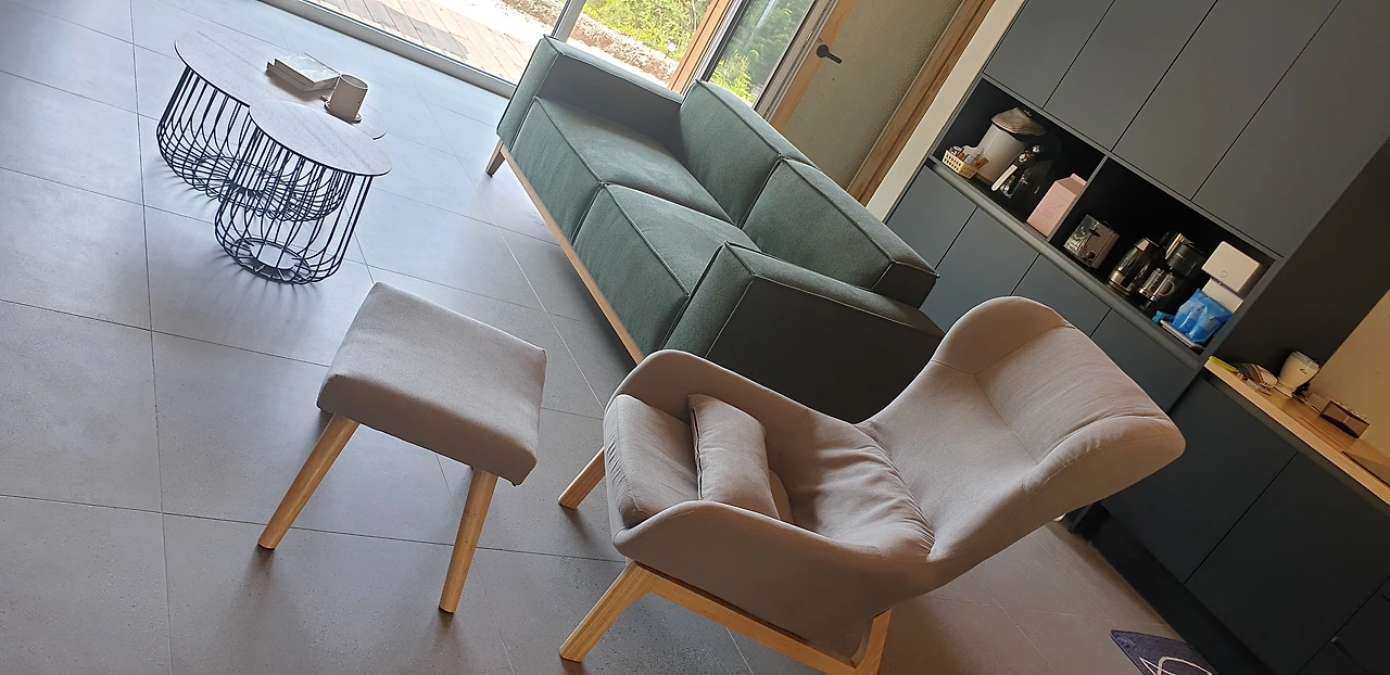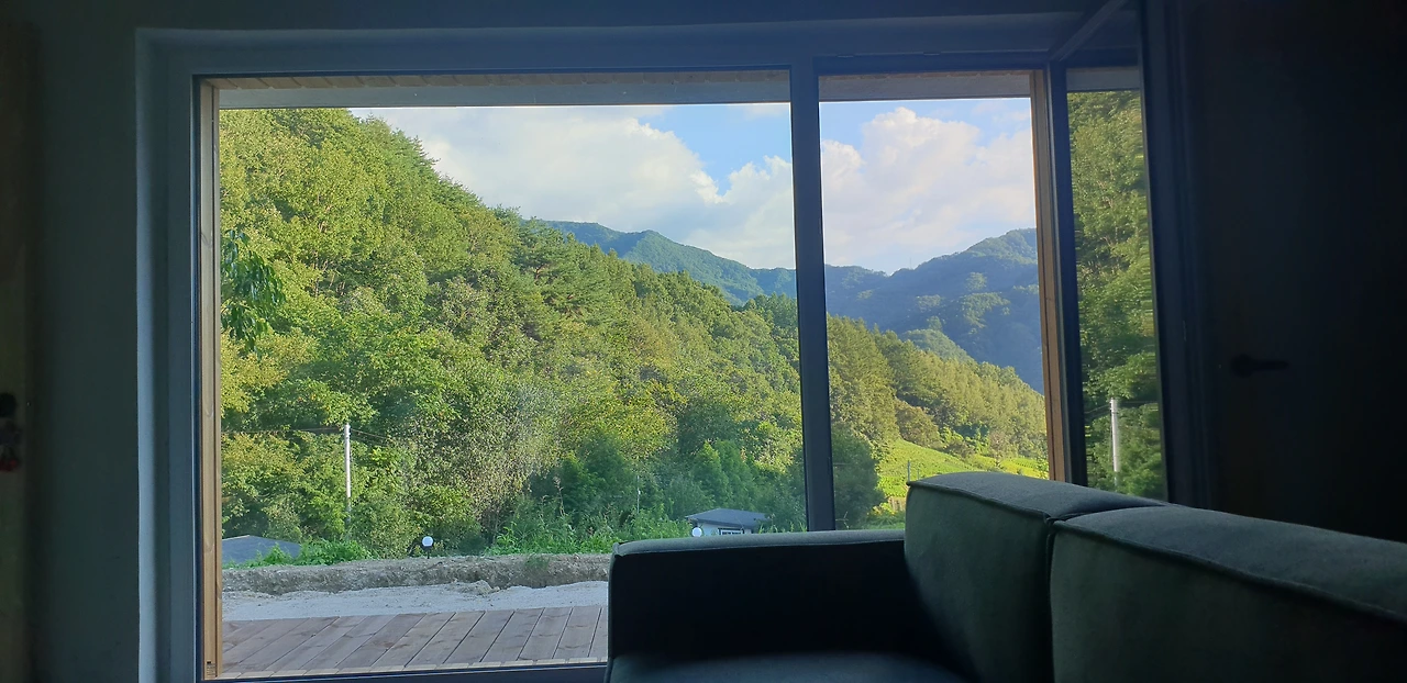 거실 창 너머로 펼쳐지는 그림 같은 풍경을 감상하며