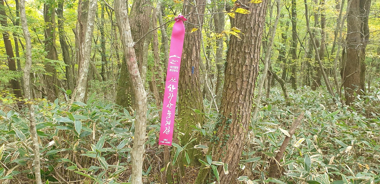 한라산 둘레길 리본은 위에서 보는 것처럼 분홍색이다.