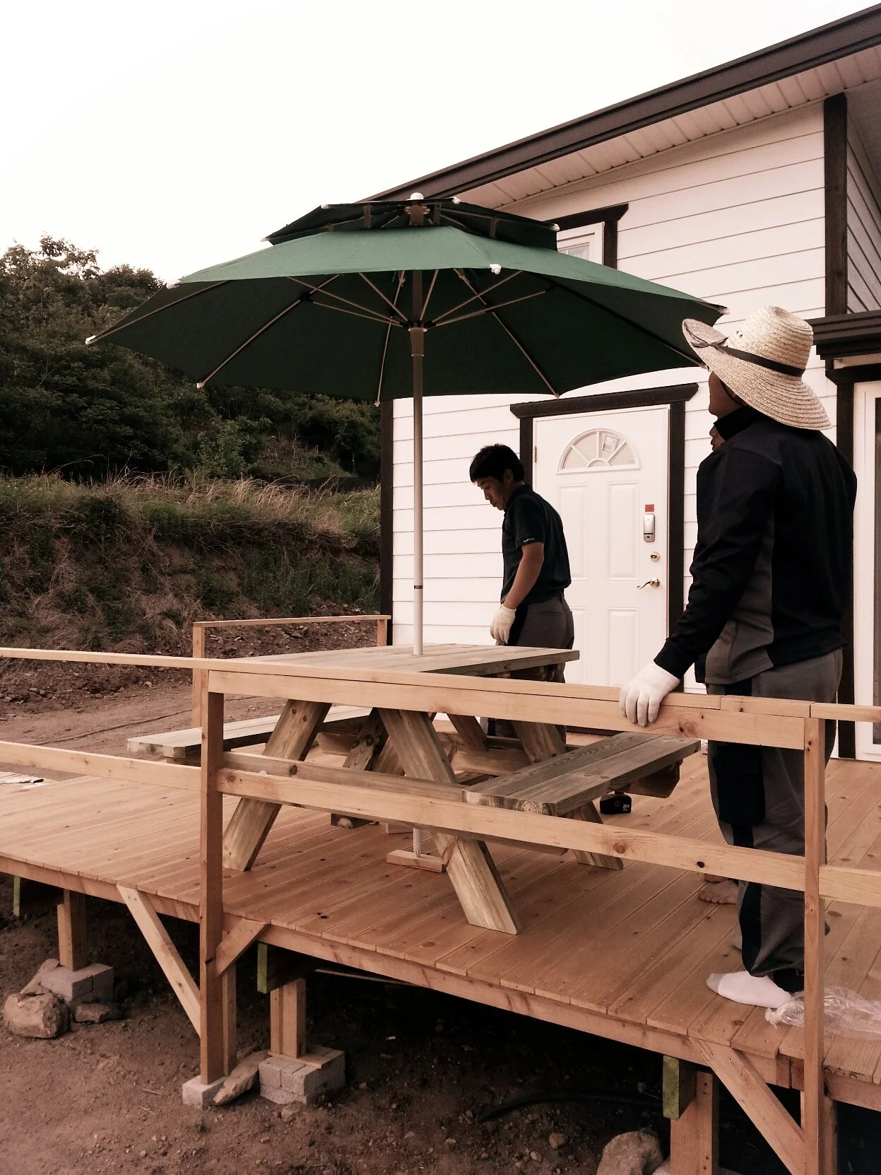 완성된 데크 위에 파라솔을 펴니 진정한 전원 세컨드 하우스가 완성된 것 같습니다.